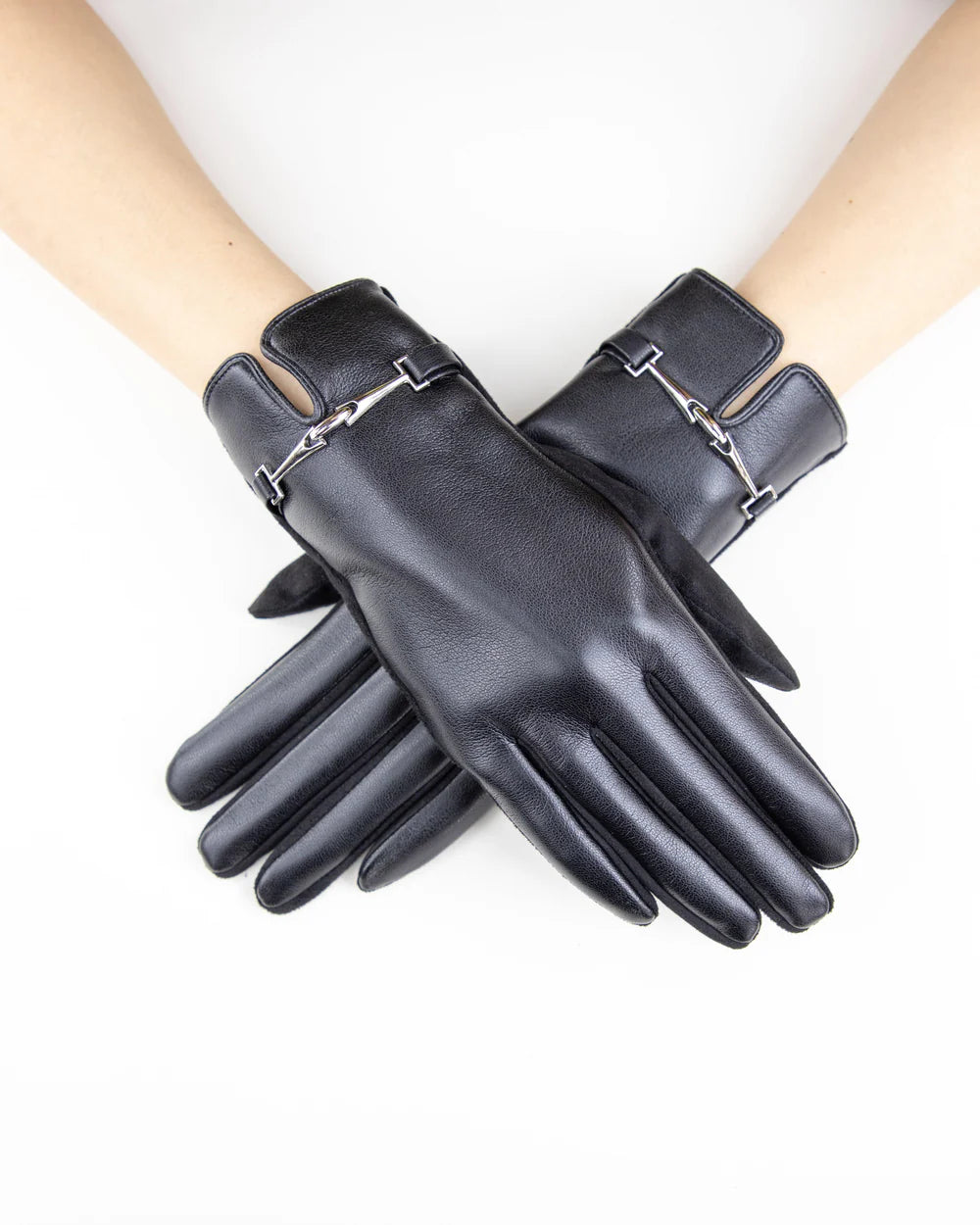 Beautiful gloves in faux leather with chain link detail with touch screen function.