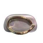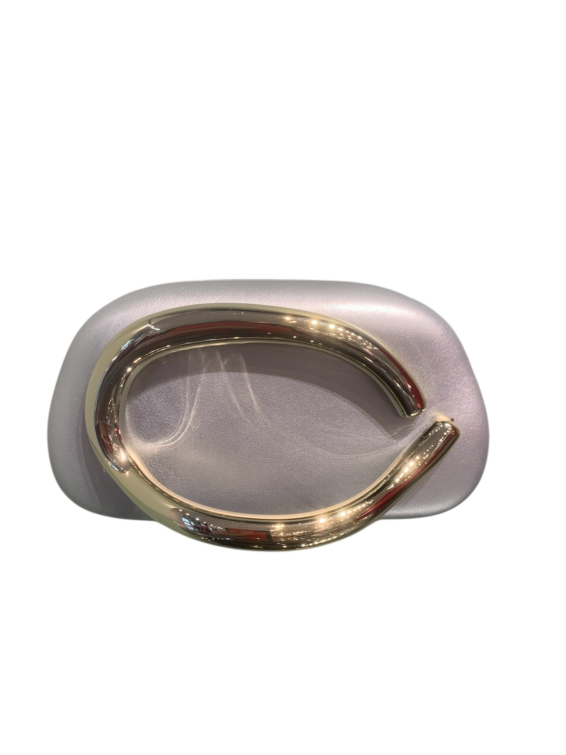 This beautiful clutch handbag features a structured, hard-shell body in a matte  finish with a prominent, sculptured gold handle that forms an abstract C or crescent shape. Includes a removable crossbody chain.