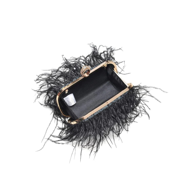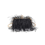 • Exterior Details: Ostrich Feather Fringe All-Over, Rhinestone Ring Handle, Gold Hardware