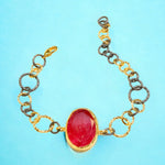 This beautiful bracelet features gold plated brass and a red stone. Handmade in Turkey.