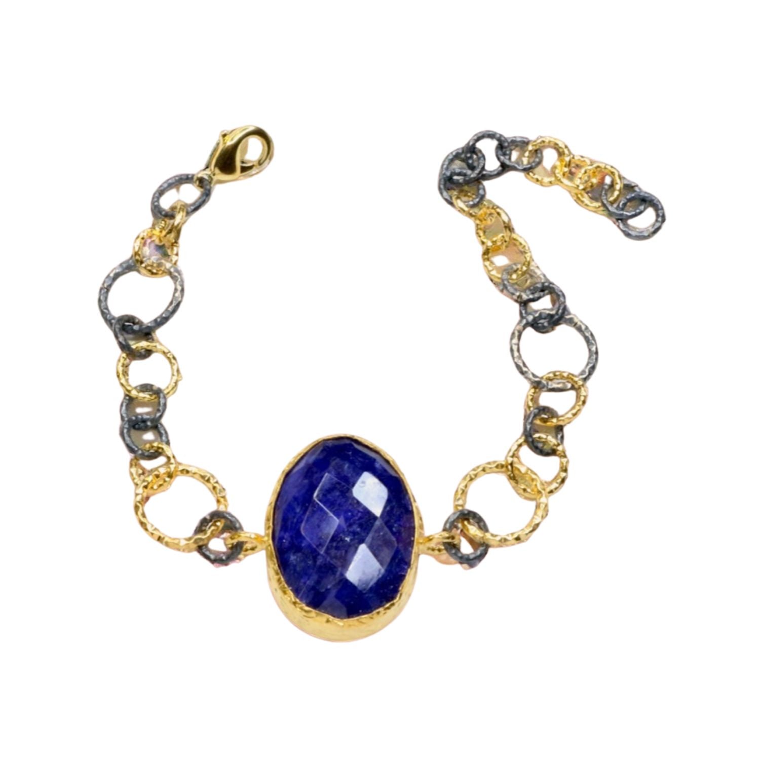 This beautiful bracelet features gold plated brass and a blue stone. Handmade in Turkey.