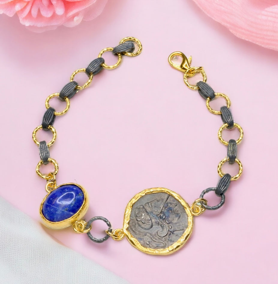 This beautiful bracelet features gold plated brass with a blue stone and coin double pendant. Handmade in Turkey.