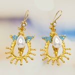 These beautiful earrings feature gold plated brass with pearl like stones and teal blue crystals. Handmade in Turkey.