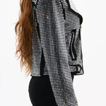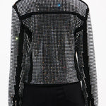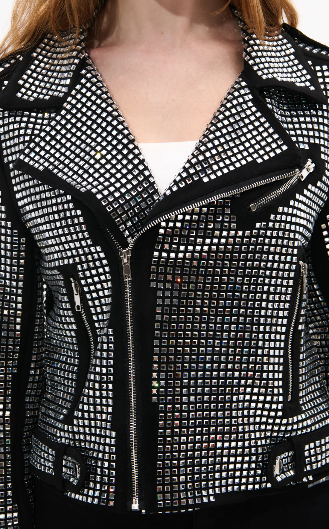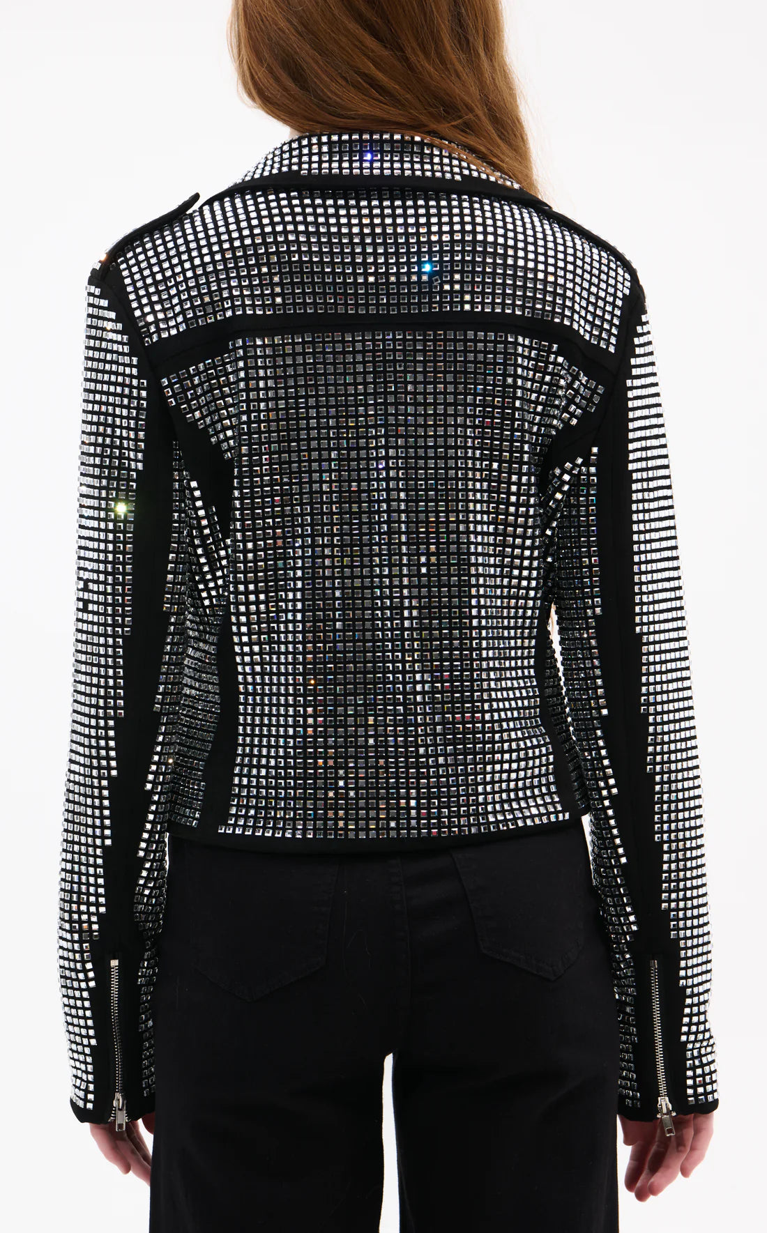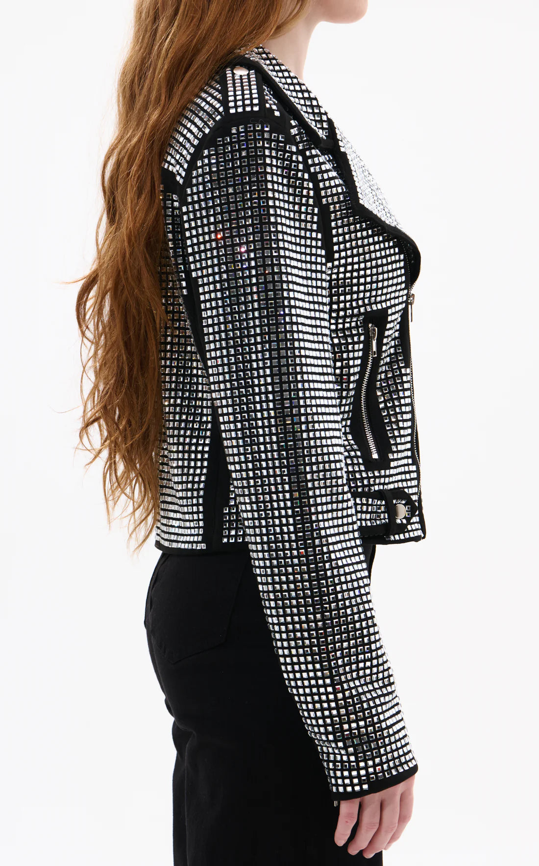 Glimmering square rhinestones lend punk-rock glam to a chic Moto jacket fixed with biker-inspired zippers.