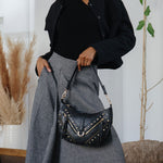 Our Maeve shoulder bag seamlessly combines edgy style with functional design. Featuring a distressed finish, stud accents, and a unique zipper teeth design, this bag is perfect for staying organized and stylish. Includes a detachable and adjustable crossbody strap.