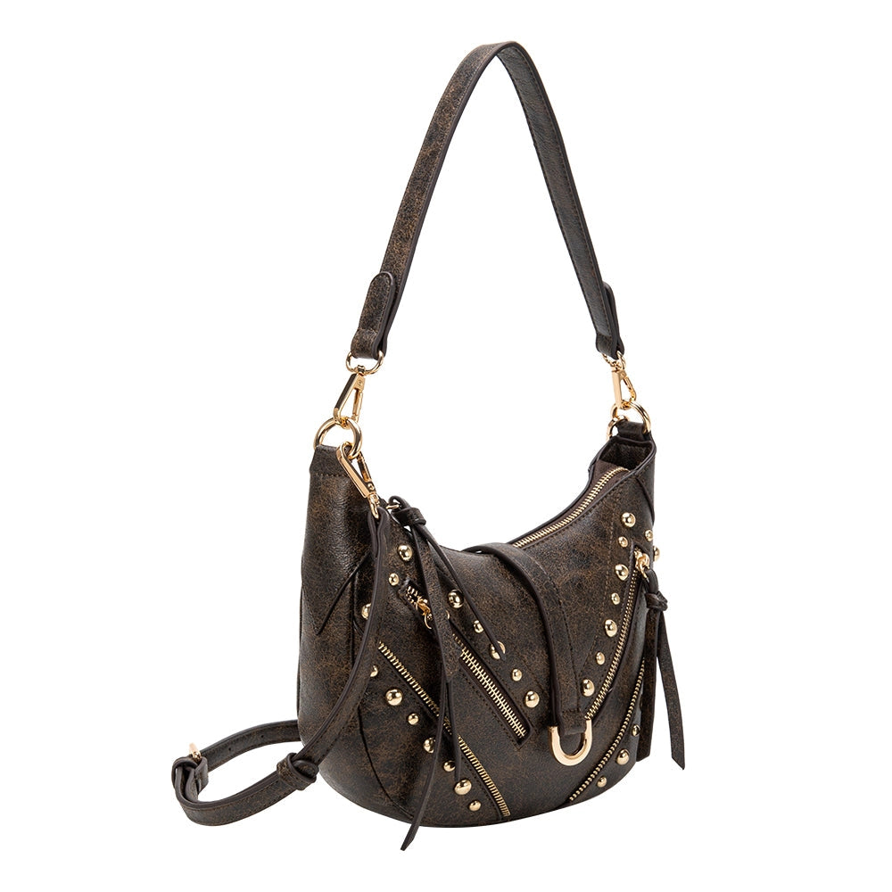 Our Maeve shoulder bag seamlessly combines edgy style with functional design. Featuring a distressed finish, stud accents, and a unique zipper teeth design, this bag is perfect for staying organized and stylish. Includes a detachable and adjustable crossbody strap.