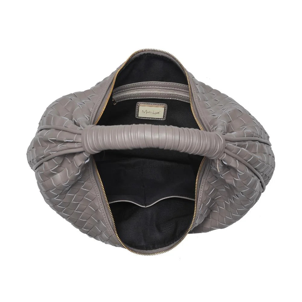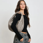 This vegan leather hobo is the epitome of effortless chic. With its all-over woven design, polished gold hardware, and stylish pull tabs, it brings a touch of elegance to any ensemble. The interior is thoughtfully designed with fabric lining, a zip pocket, and two slip pockets to keep your essentials organized while you strut your stuff.
