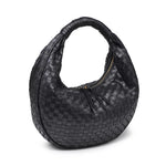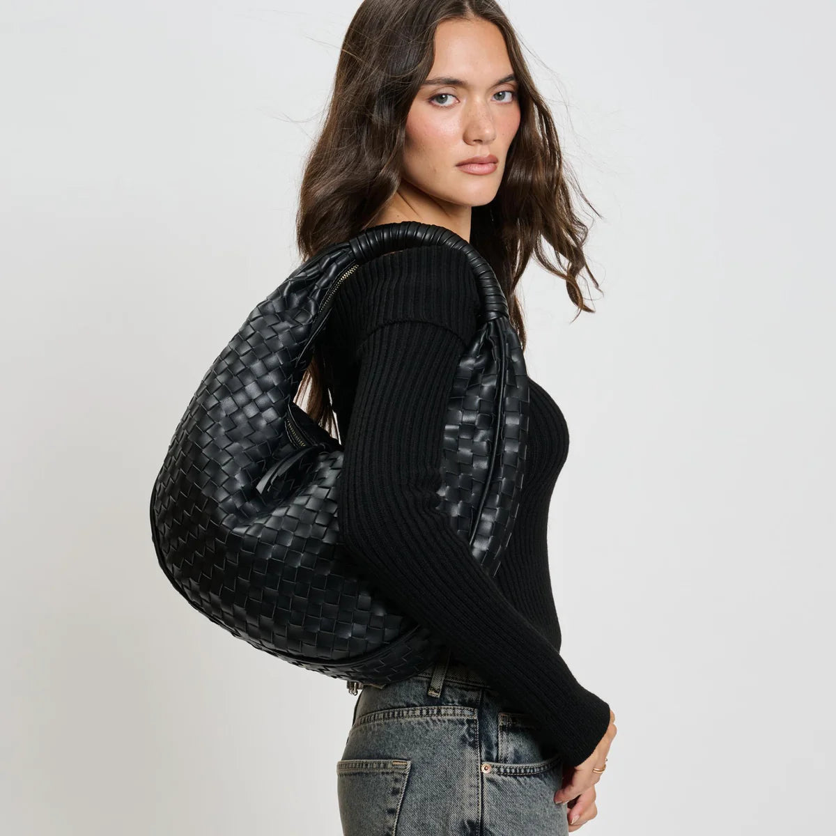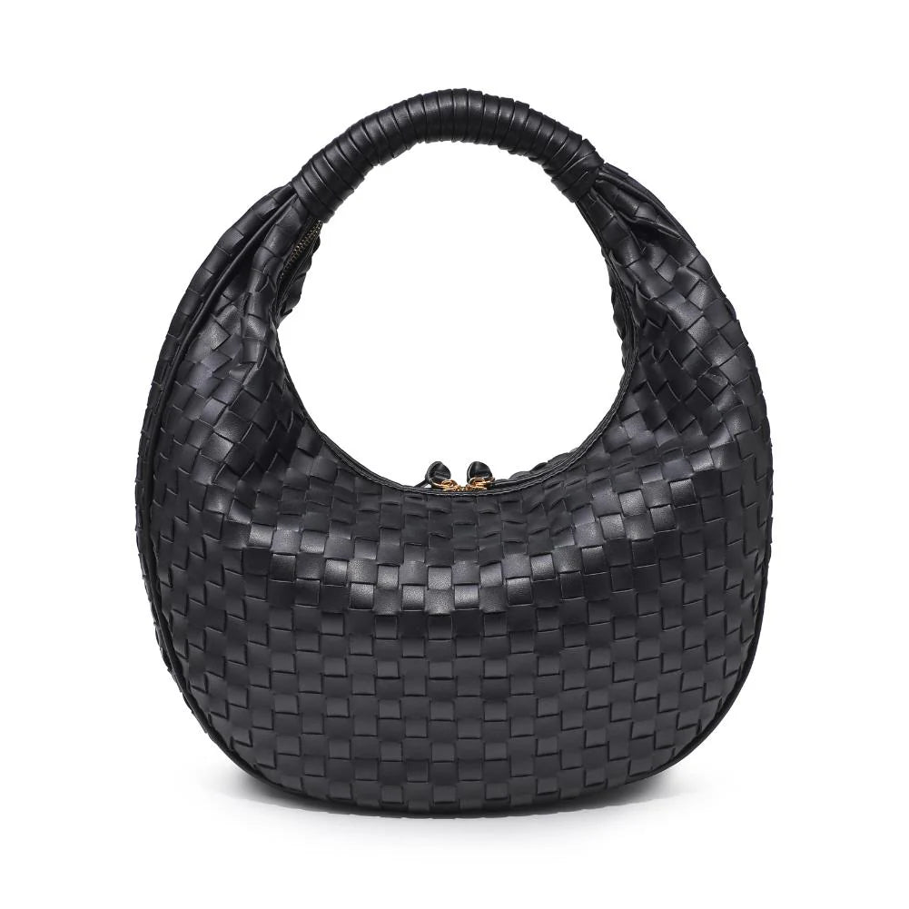 This vegan leather hobo is the epitome of effortless chic. With its all-over woven design, polished gold hardware, and stylish pull tabs, it brings a touch of elegance to any ensemble. The interior is thoughtfully designed with fabric lining, a zip pocket, and two slip pockets to keep your essentials organized while you strut your stuff.