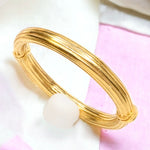 Gold bangle bracelet with a white bead on a white background