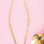 Gold colored necklace with a pearl like pendant and blue stone accents on a chain on a white background