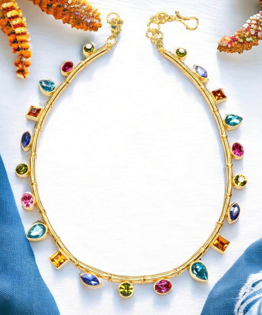 This beautiful necklace features gold plated brass and multicolored crystals in a variety of complimentary shapes. Handmade in Turkey.