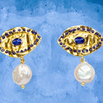 Gold colored eye shaped earrings with blue stones and pearl like accent drops on a blue background