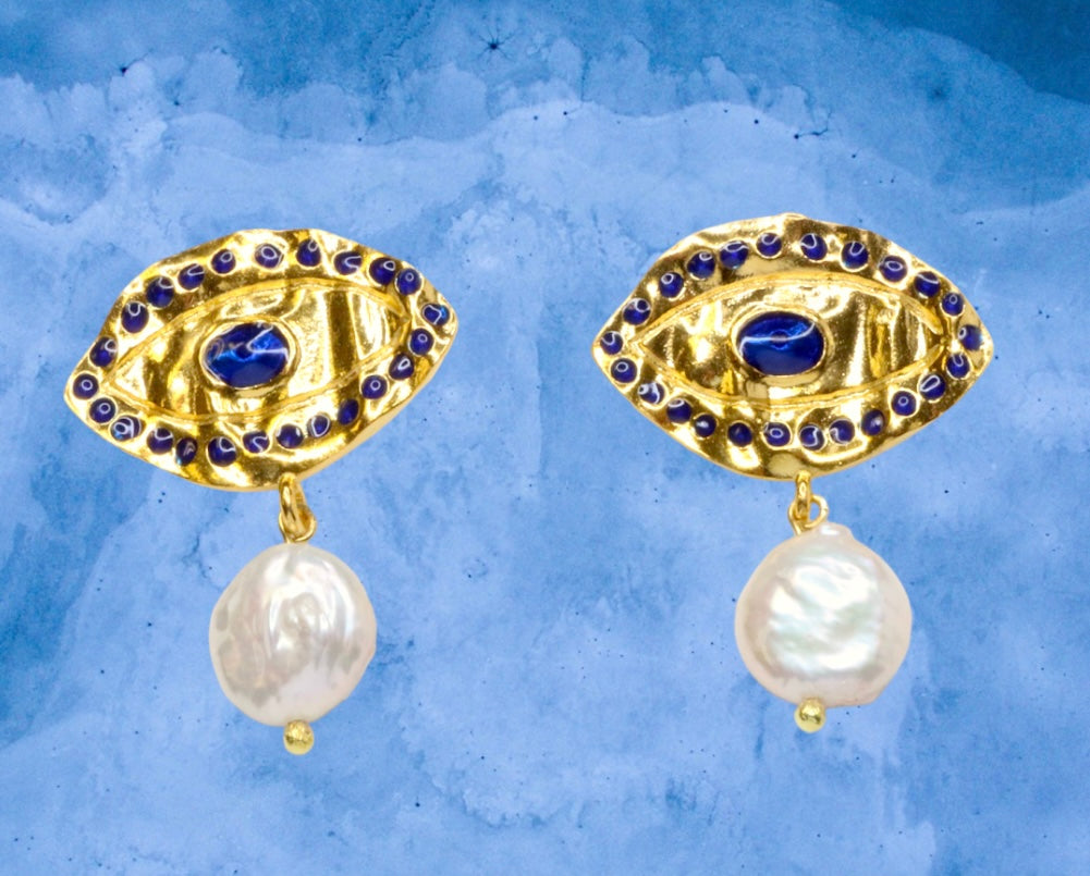 These beautiful eye inspired earrings feature 18k gold plating over brass with blue crystal and pearl like detail. Handmade in Turkey.