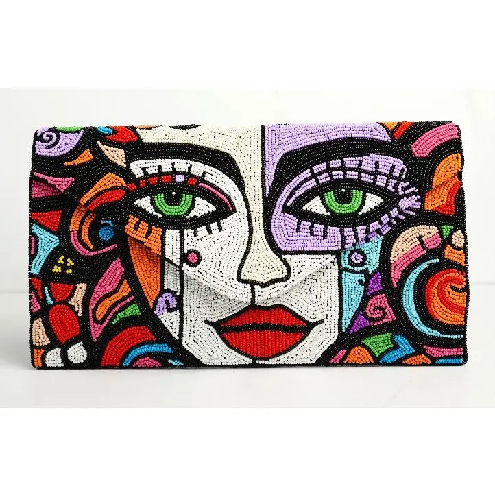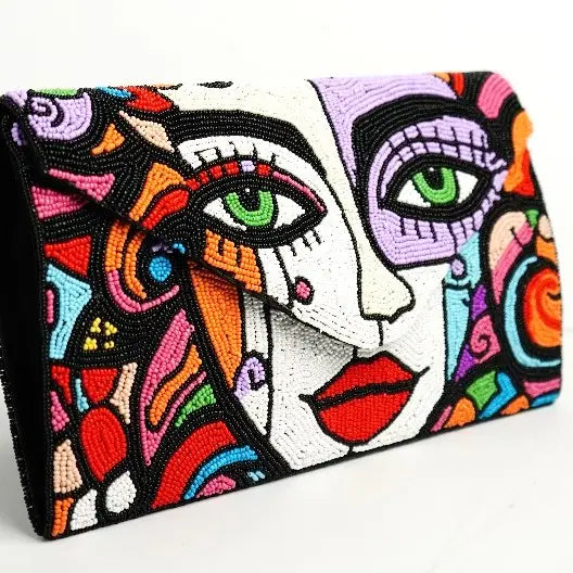 All side beaded clutch with crossbody chain handle. This beautiful wearable art piece features hand-crafted beading to create a dazzling display of color and texture. The centerpiece is a striking modern face featuring gorgeous green eyes and bold red lips. The blending of abstract lines and expressive features creates truly unique look.