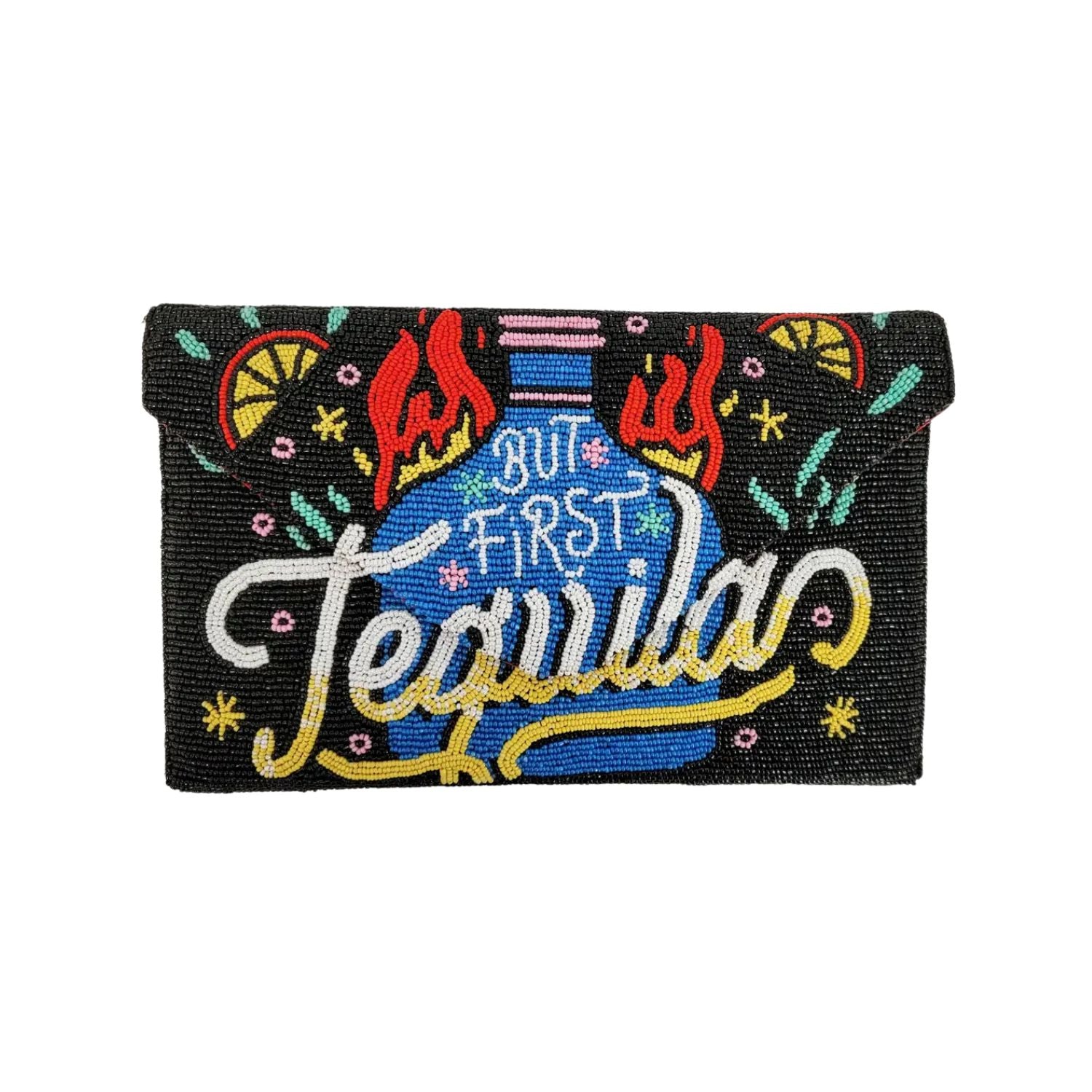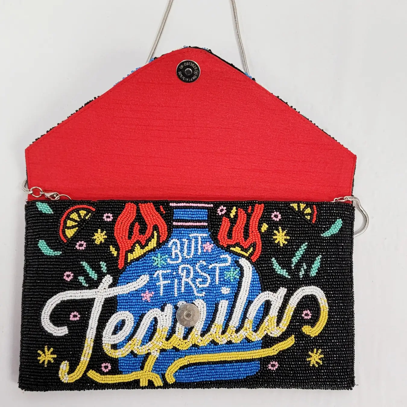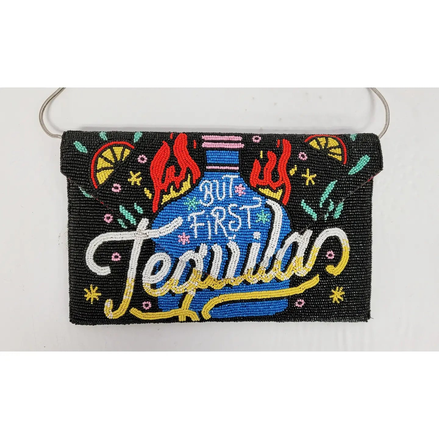 Ready to spice up your style? Meet your new party sidekick: the “But First, Tequila” Beaded Clutch Handbag! This playful, hand-beaded clutch is bursting with personality, featuring a vibrant tequila bottle, fiery flames, citrus slices, and colorful accents—all set against a chic black background. The bold “But First, Tequila” script makes it clear: you’re here for a good time!