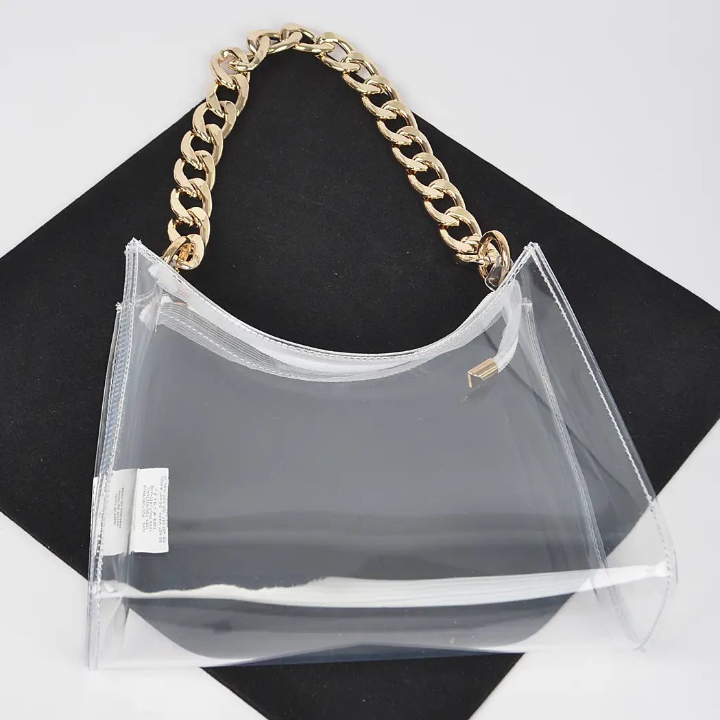 * Transparent Big Chain Bag * 8.25W*8H*2.5D * PVC, Mixed Metal Introducing the "GlimmerLink Tote" – a stunning clear bag that combines modern elegance with practicality. Featuring a chic chain strap, this bag is perfect for showcasing your style while keeping your essentials visible. Elevate your accessory game with the GlimmerLink Tote, where transparency meets luxury.