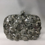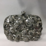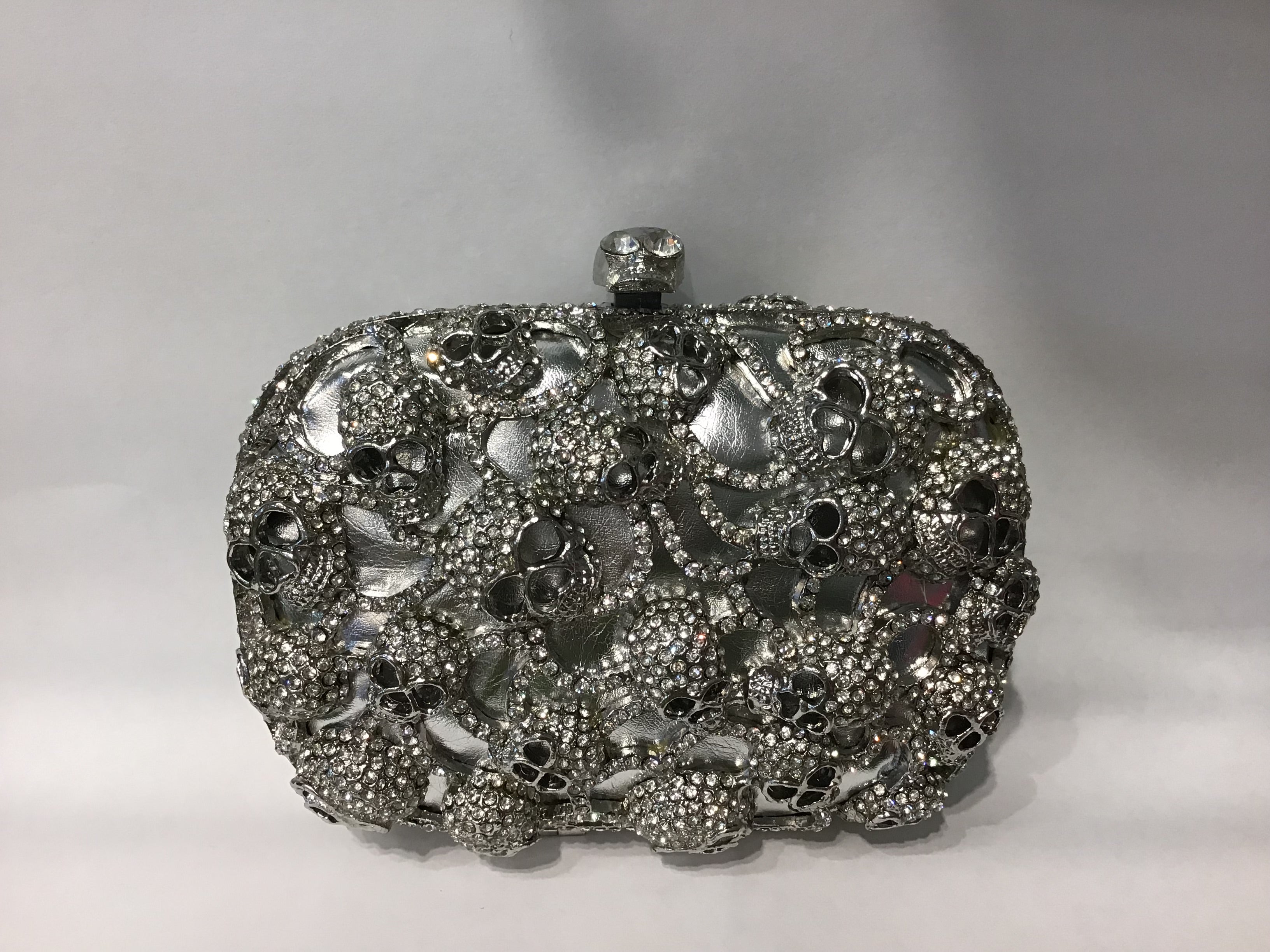 Encrusted with crystals and metal hardware. Skull shaped clasp, push down opening, silver fabric lining, and a silver chain.
