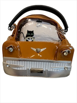 Car-Shaped mini handbag with many car details. Zippered closure. Fuzzy dice on the rear view mirror. An adorable cat driver. Clear windshield in the front.Such a fun handbag for all ages.