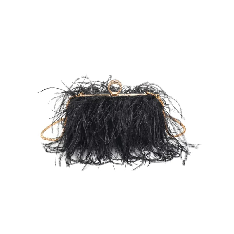 • Exterior Details: Ostrich Feather Fringe All-Over, Rhinestone Ring Handle, Gold Hardware