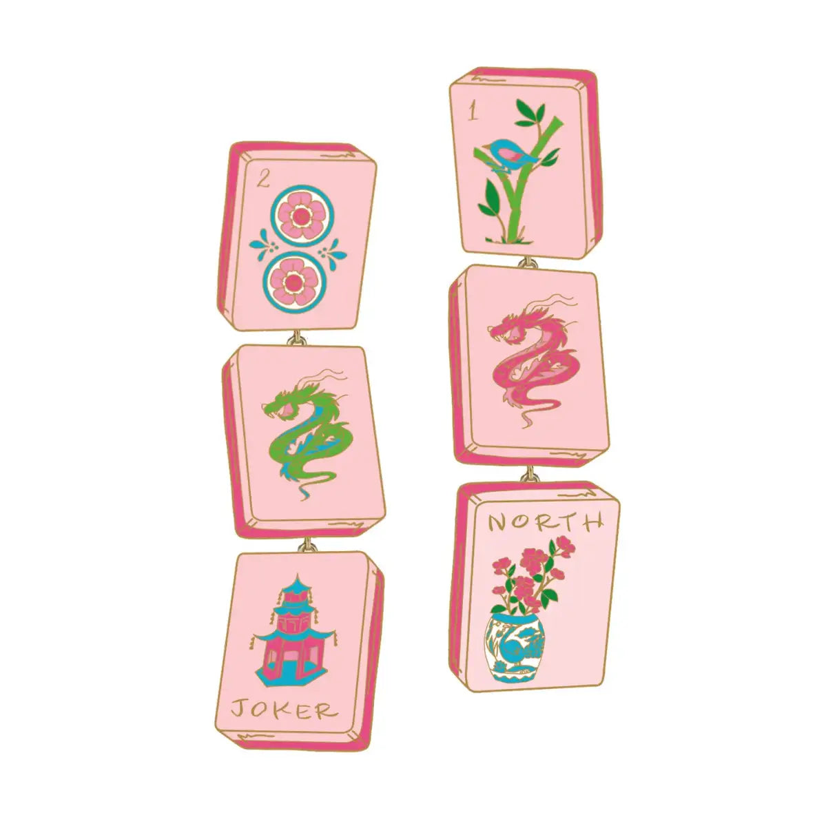 The Linked Mahjong Tile Earrings in Light Pink feature Mahjong tile charms connected together in a stylish link design. With soft pink enamel and a polished gold finish, these earrings add a playful yet sophisticated touch to your jewelry collection. DETAILS Base Metal with Shiny Gold Plating