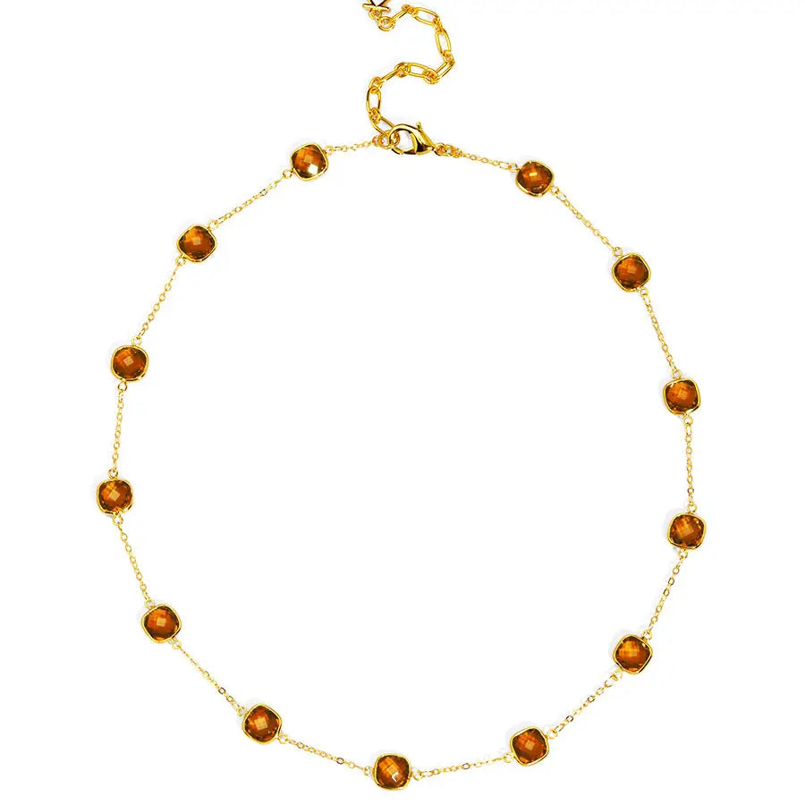 Collar necklace embellished with orange crystals. -