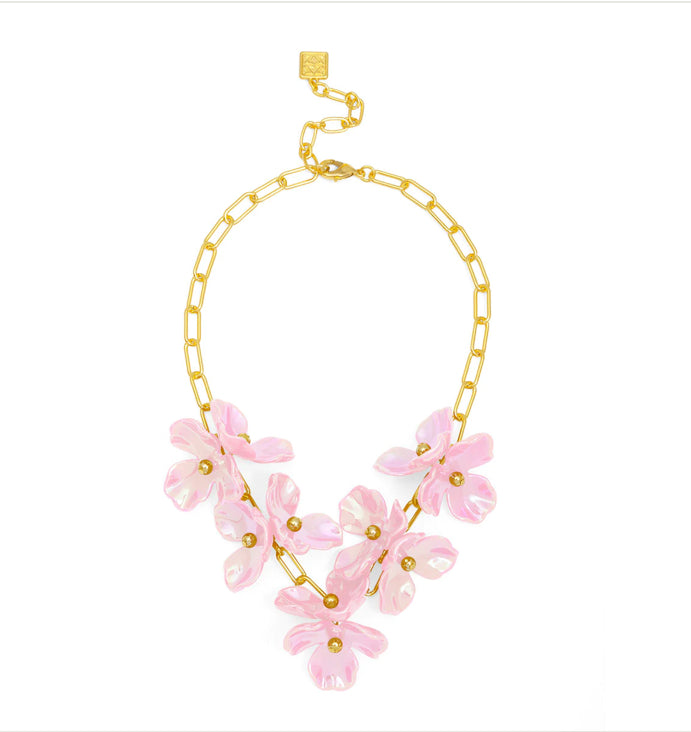 Gold chain collar necklace with resin petals in an iridescent finish. This style is completed with a lobster claw closure.