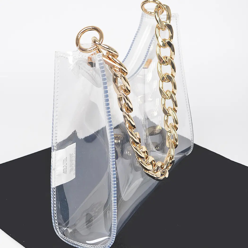 * Transparent Big Chain Bag * 8.25W*8H*2.5D * PVC, Mixed Metal Introducing the "GlimmerLink Tote" – a stunning clear bag that combines modern elegance with practicality. Featuring a chic chain strap, this bag is perfect for showcasing your style while keeping your essentials visible. Elevate your accessory game with the GlimmerLink Tote, where transparency meets luxury.
