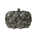 Encrusted with crystals and metal hardware. Skull shaped clasp, push down opening, silver fabric lining, and a silver chain.