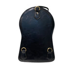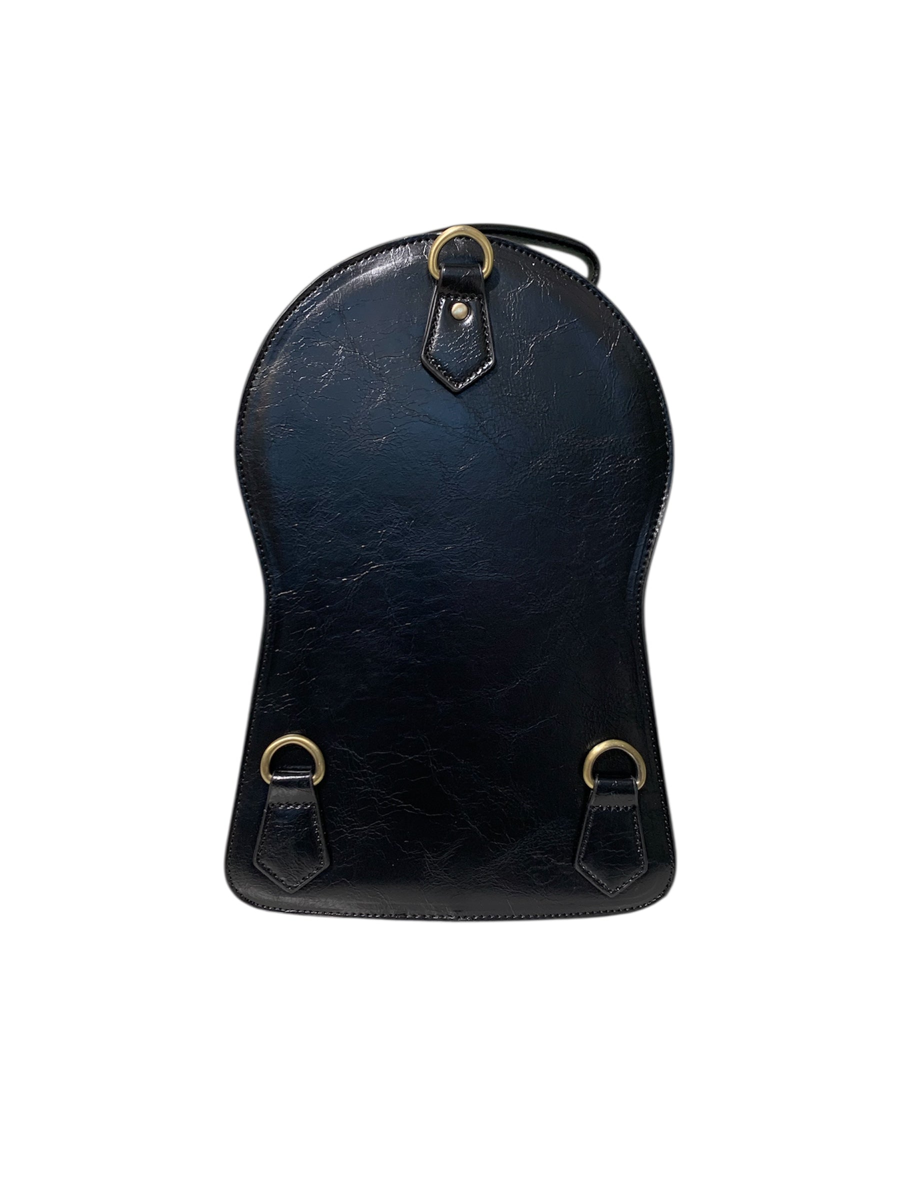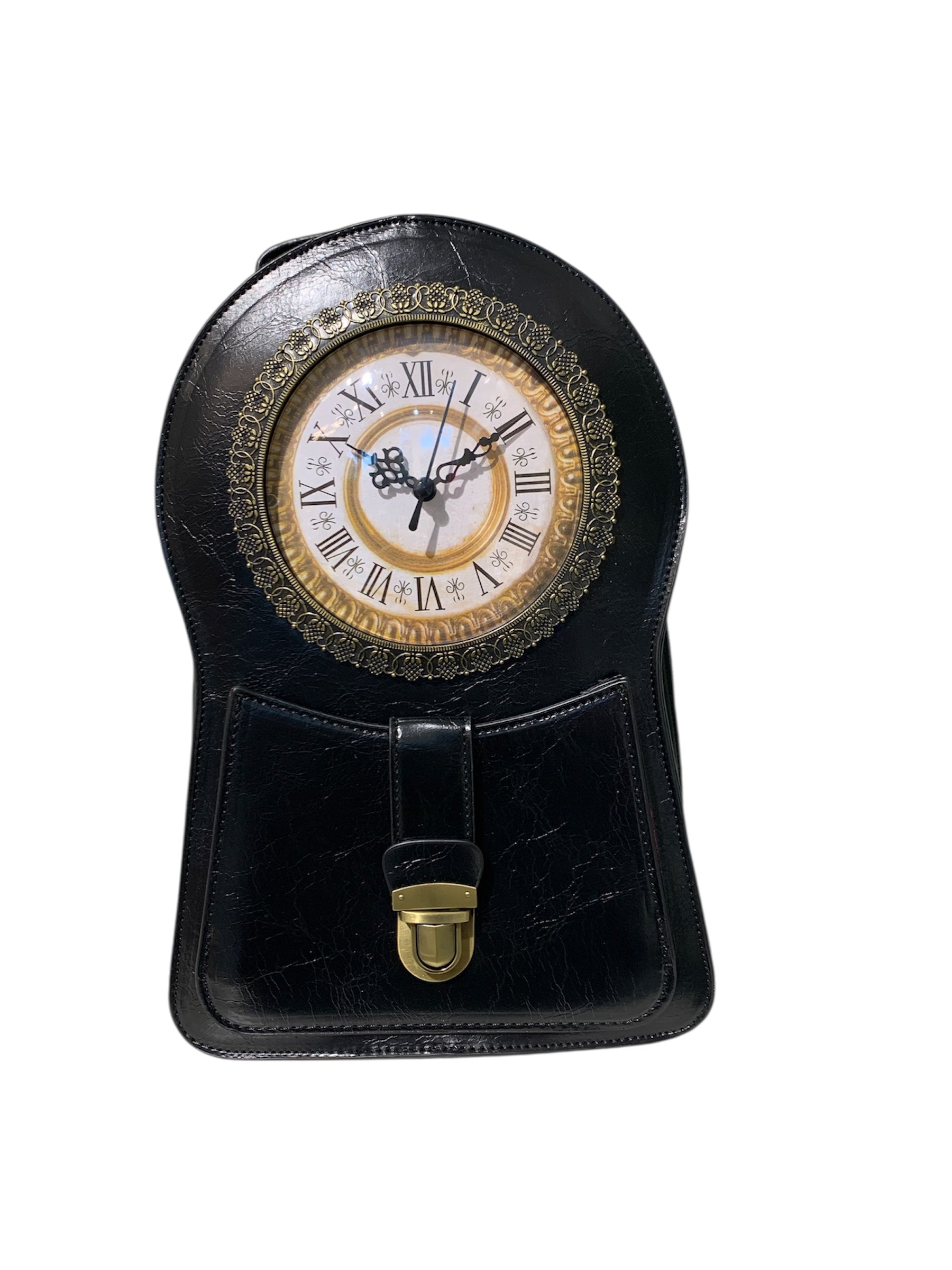 LGrandfather clock-shaped handbag. The clock is a working timepiece. Faux leather outside.  Convertible strap for use as a backpack or crossbody.  Roman numerals on the clock face. AA batteries are needed for the operation of the clock.