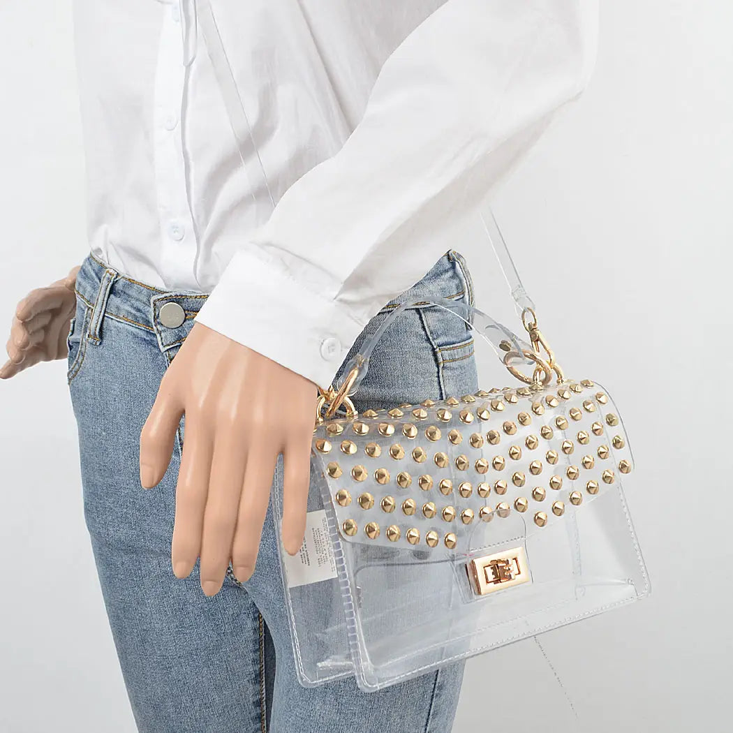 * Studded Transparent Top Handle Bag * 9.25W*5.25H*2.25D * Pvc,Mixed Metal.