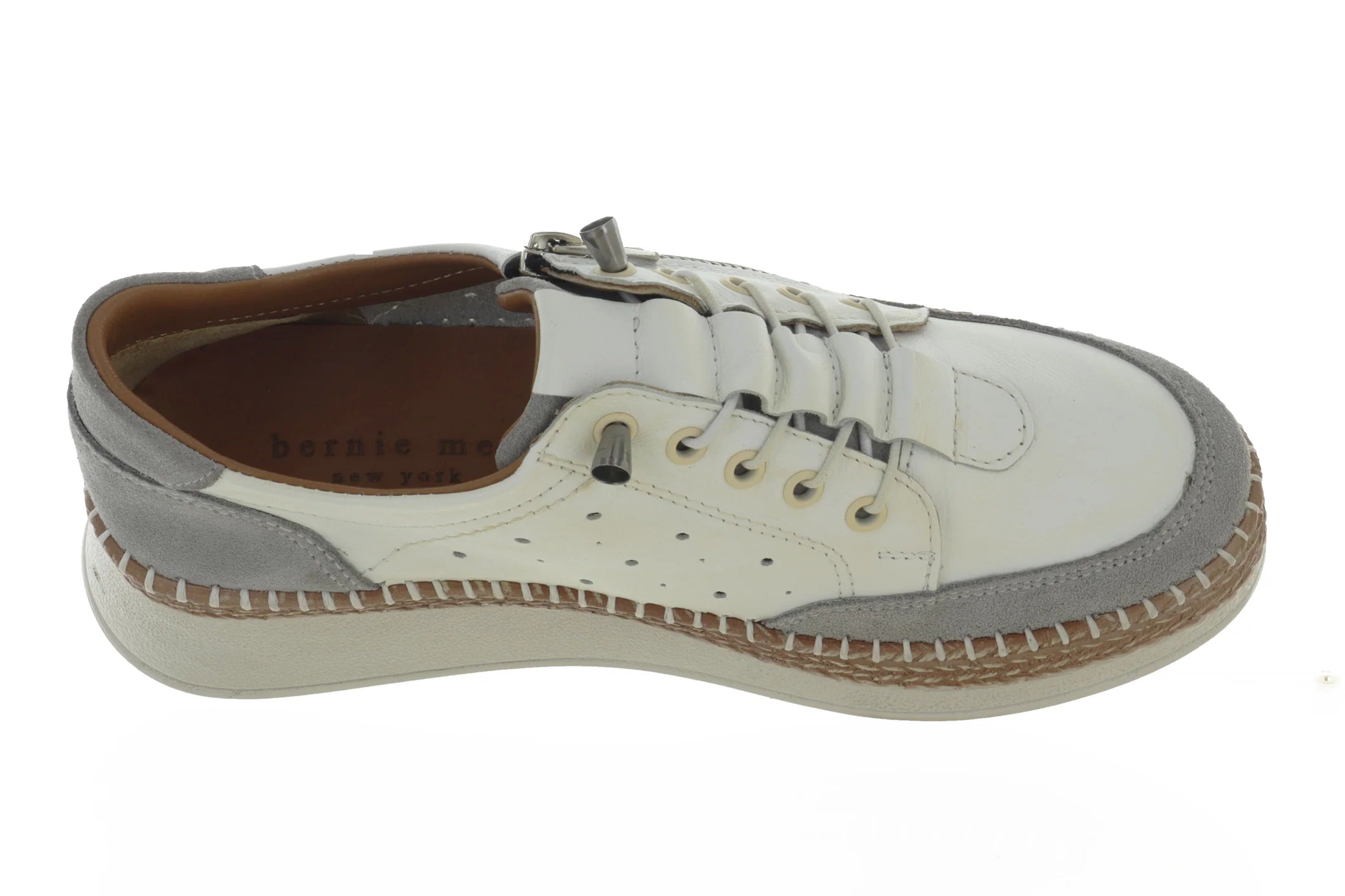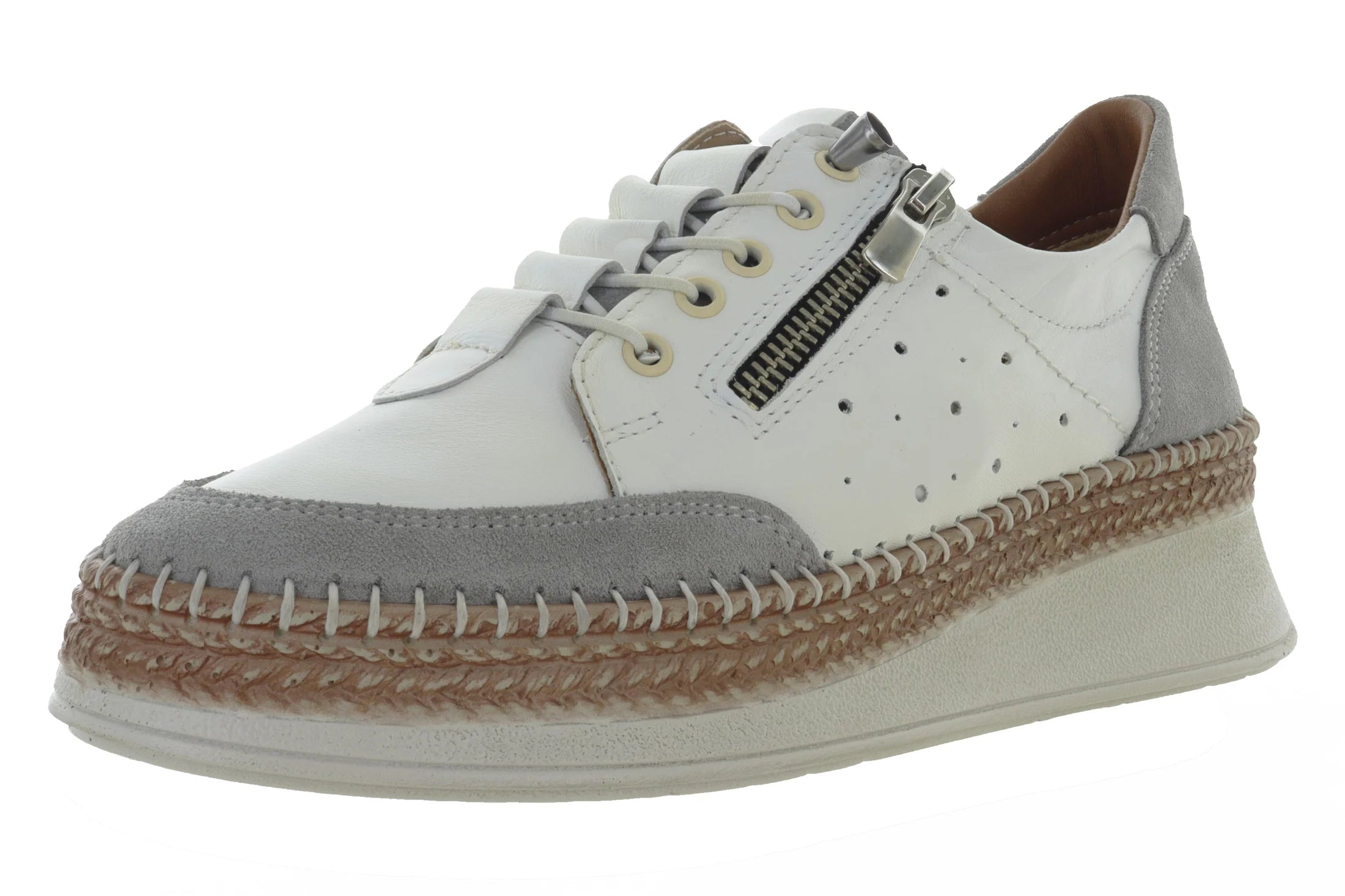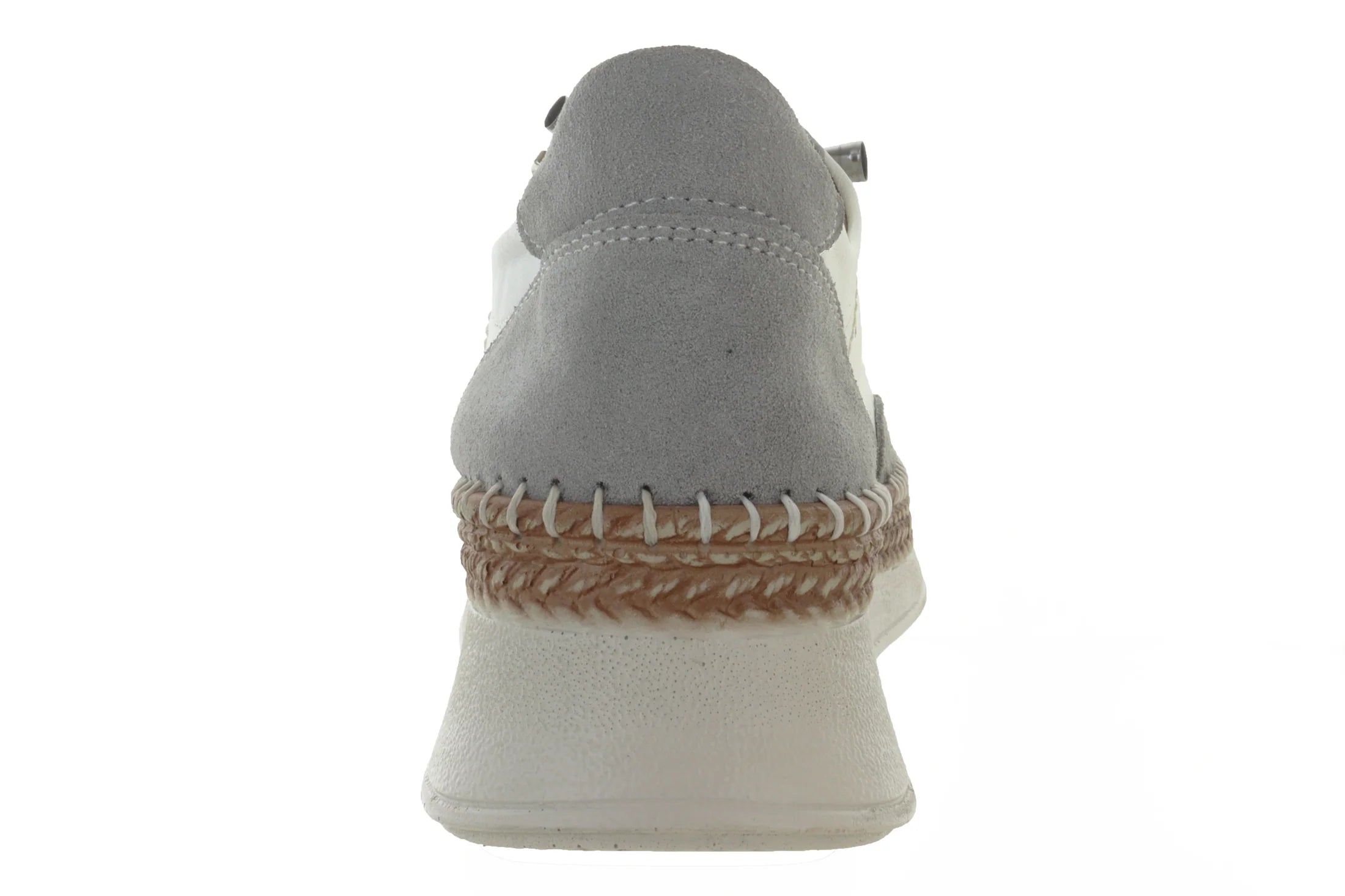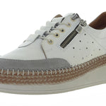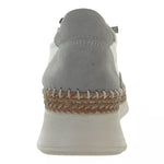 The Tallulah is a stylish low-top sneaker that blends casual and contemporary design elements. The upper is primarily white leather with perforated details for breathability, complemented by soft gray suede accents on the toe cap and heel counter. A decorative silver zipper on the side adds a modern touch alongside traditional lace-up closure. The platform sole is uniquely designed with a woven espadrille-style midsole, featuring thick, visible stitching for a handcrafted look. The bottom sole is made of rubber, ensuring durability and comfort for all-day wear. This sneaker is a perfect mix of sporty and chic, making it a versatile addition to any wardrobe. #DS364