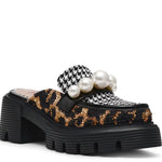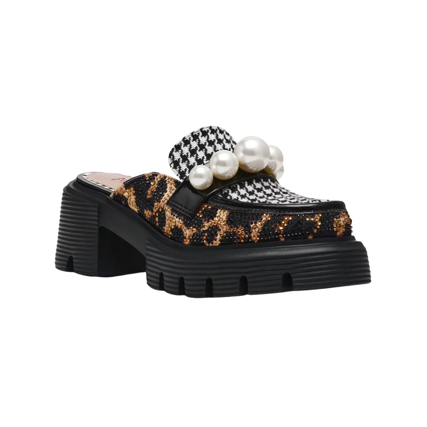 Stand out in this strong style from Betsey Johnson. The Haizel loafers feature two distinct patterns, including a sophisticated houndstooth print and a rhinestone-covered leopard pattern. Complete with a tailored upper that sits on top of an edgy lug sole and a solid block heel.