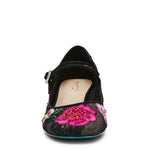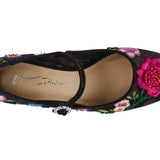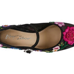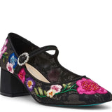 black mary jane pump heel mesh shoe with colorful flower embroidery detail and rhinestone encrusted buckle by Betsey Johnson front