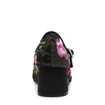 black mary jane pump heel mesh shoe with colorful flower embroidery detail and rhinestone encrusted buckle by Betsey Johnson back