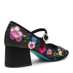 black mary jane pump heel mesh shoe with colorful flower embroidery detail and rhinestone encrusted buckle by Betsey Johnson side front