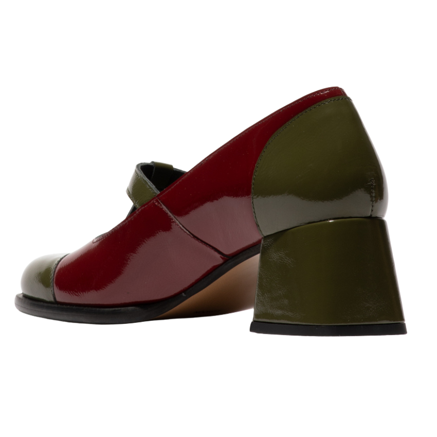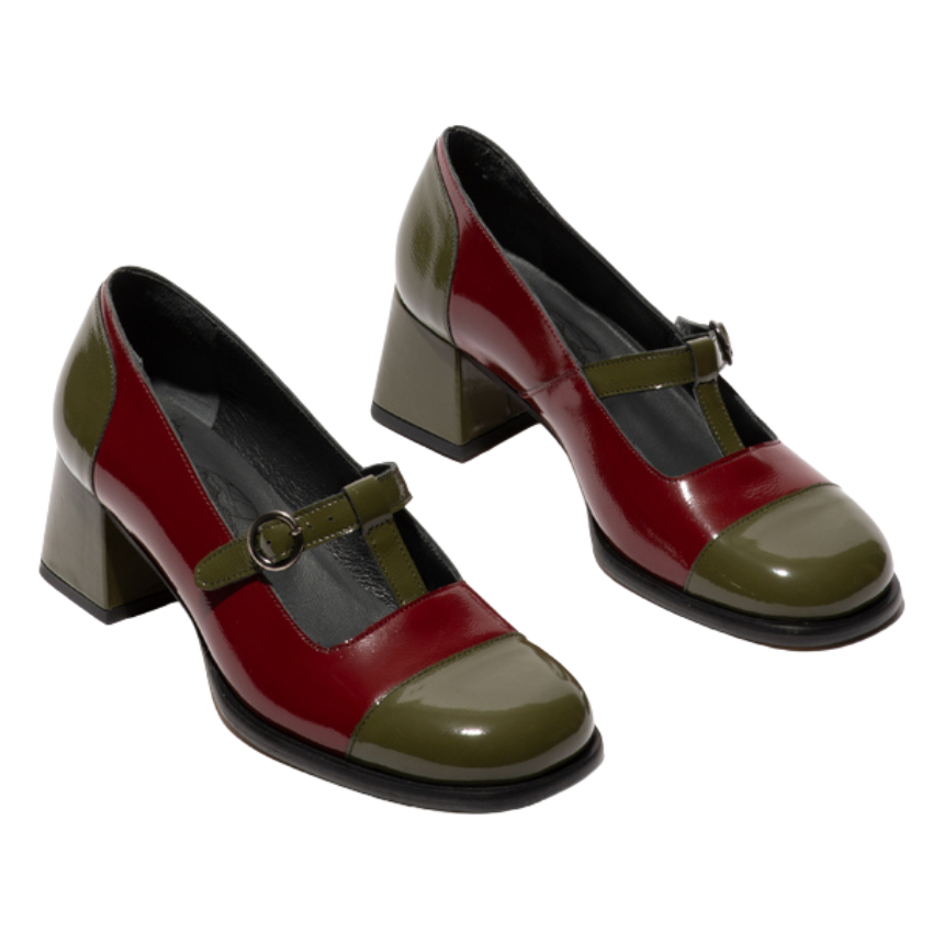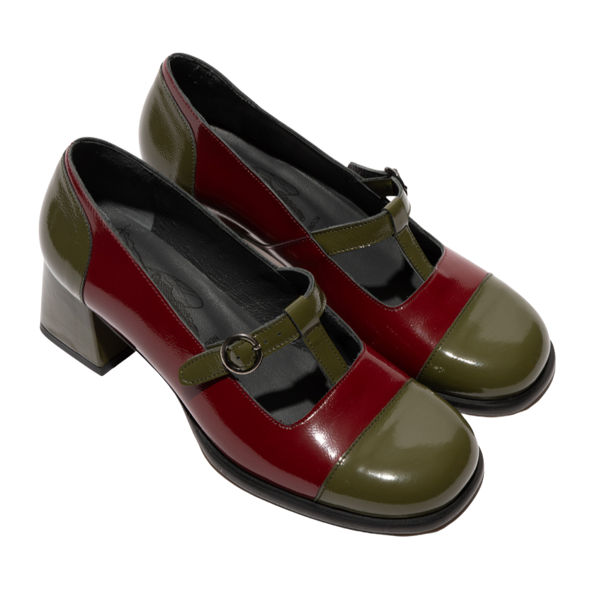 Polished patent leather elevates this retro T-strap pump sporting a bold colorblock silhouette framed by a cap toe and wrapped block heel.