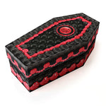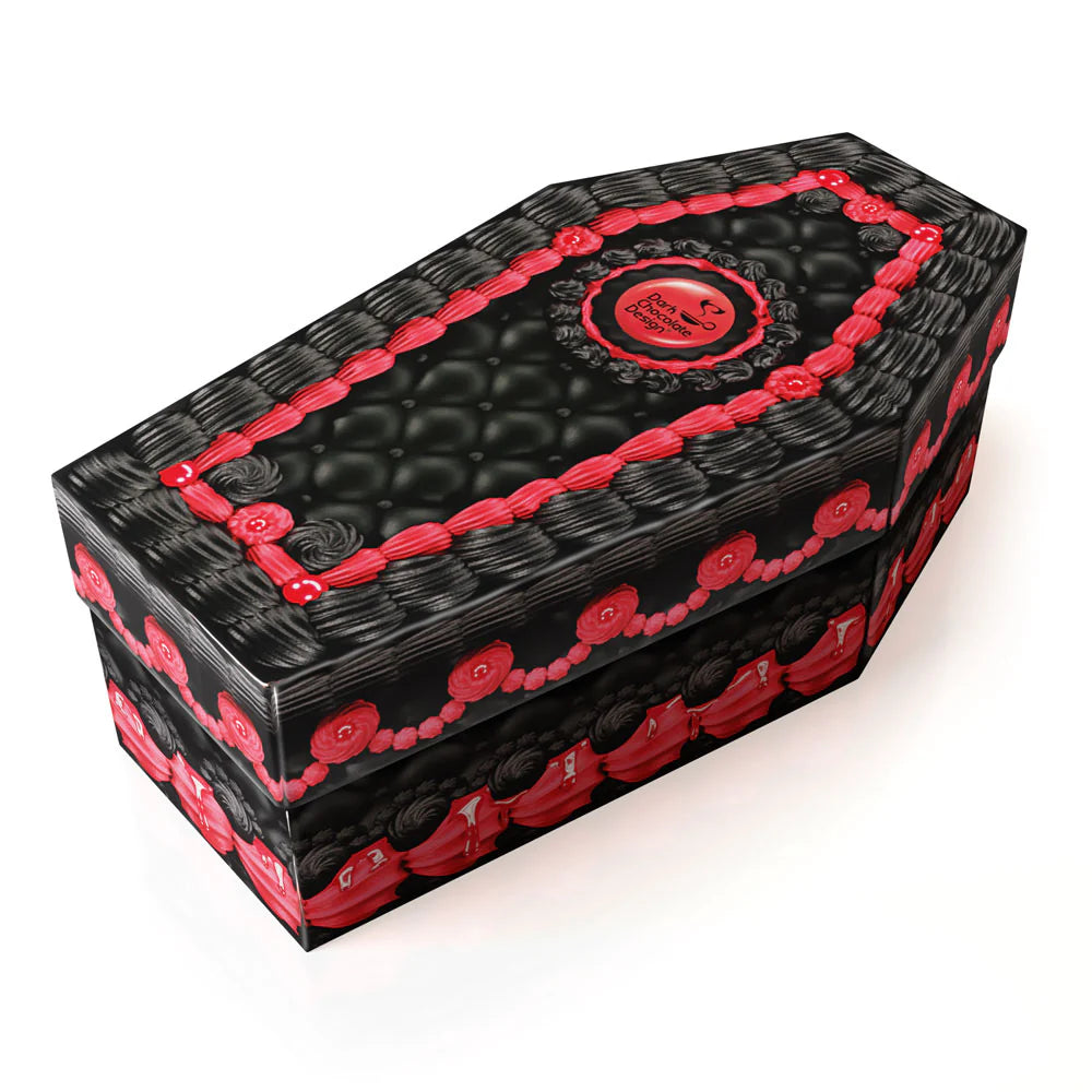 Black coffin-shaped shoe box with red decorative icing like elements on a white background