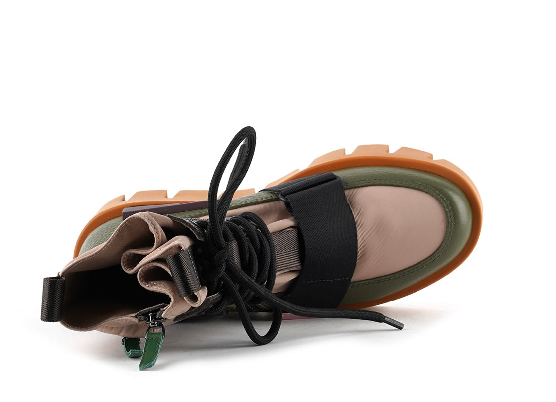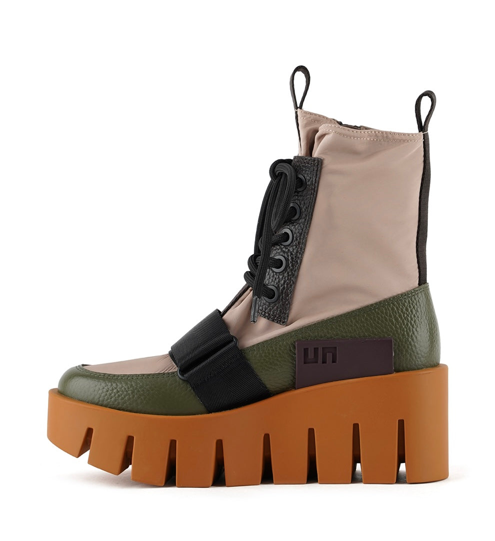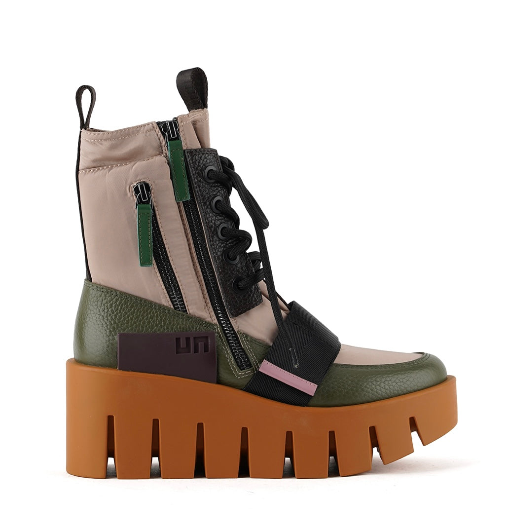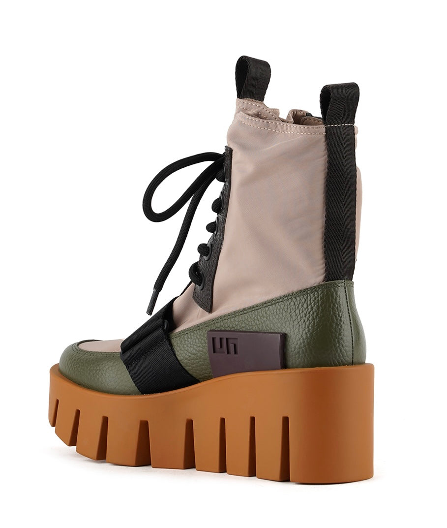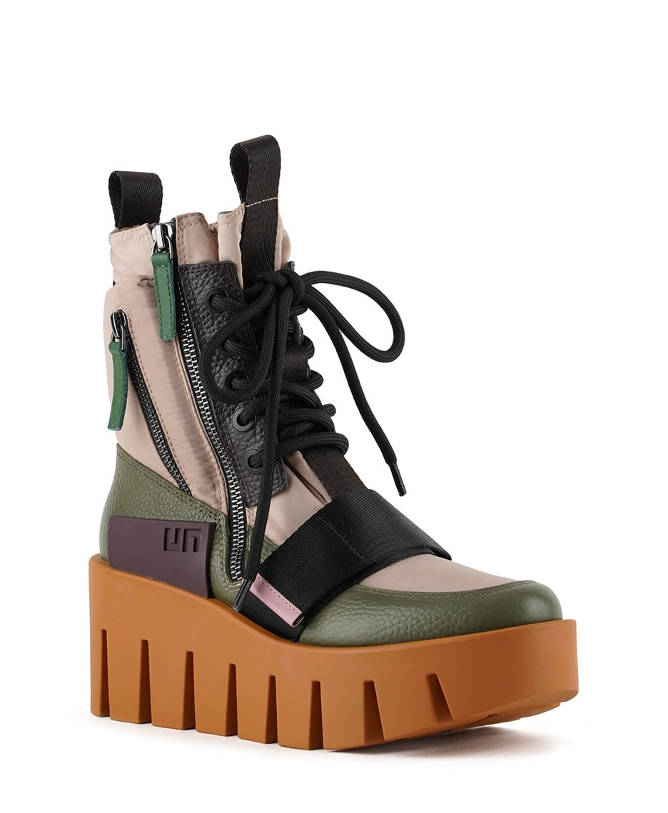 The Grip Combat is a reinterpretation of the classic combat boot with a platform lift, a statement logo block, and a defining log sole. The upper features a mix of durable materials, including tumbled leather, sporty nylon fabric, and nylon webbing, and is equipped with a functional exterior pocket. A lace-up closure, side zipper, and velcro top strap provide a secure fit and effortless on/off wear, while the chunky, cleated platform sole adds significant height and a distinctive, grip-like tread.
