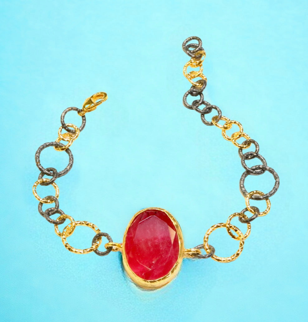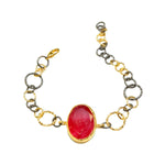 This beautiful bracelet features gold plated brass and a red stone. Handmade in Turkey.
