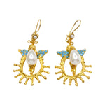 These beautiful earrings feature gold plated brass with pearl like stones and teal blue crystals. Handmade in Turkey.