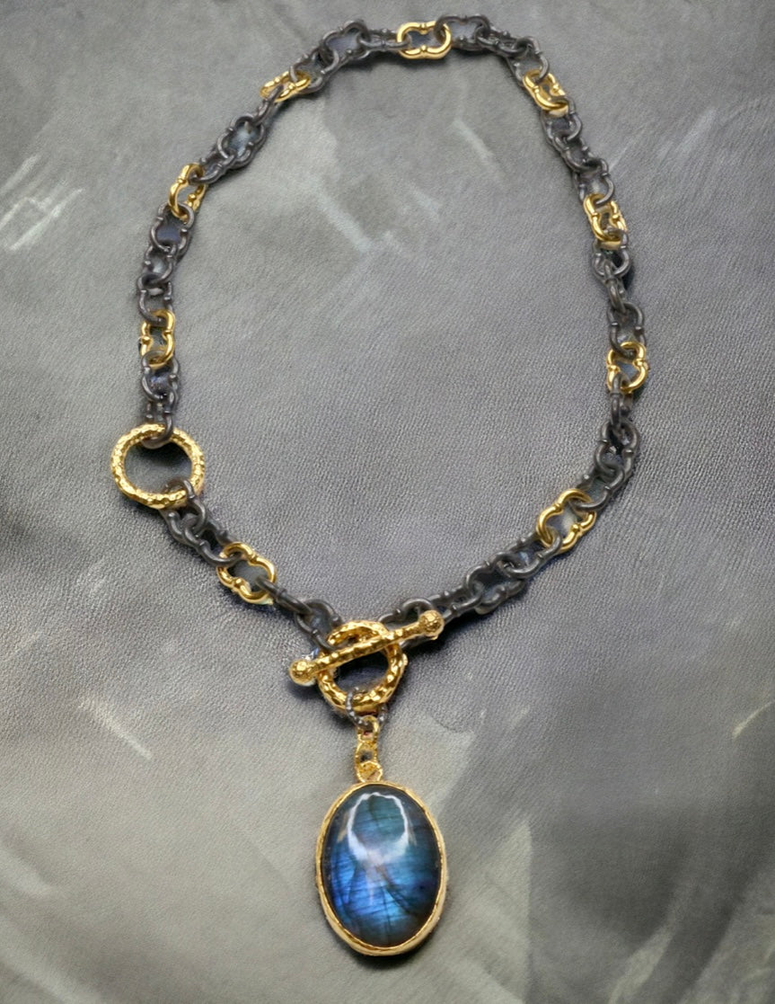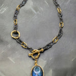 This beautiful necklace features gold plated brass and a blue stone pendant. Handmade in Turkey.