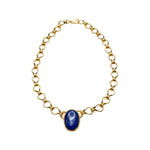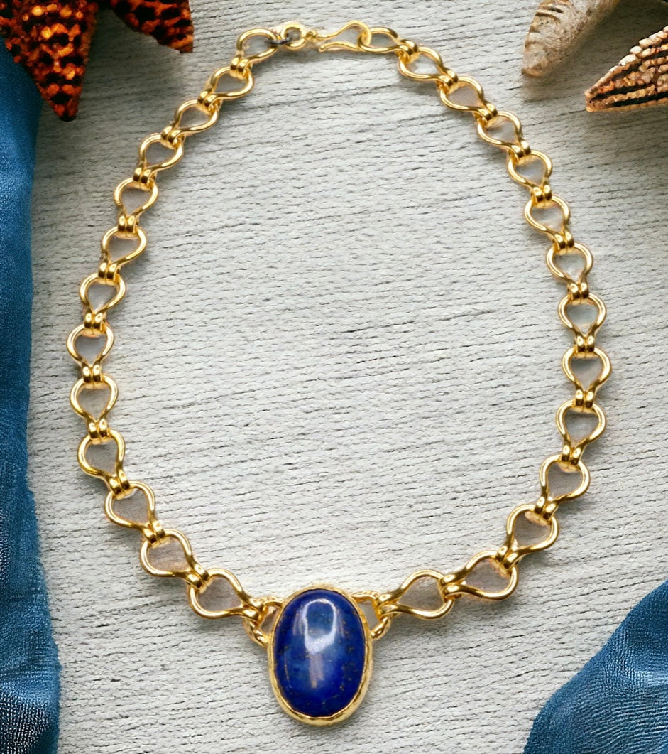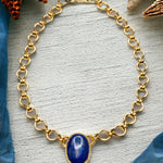 This beautiful necklace features gold plated brass and blue center stone. Handmade in Turkey.