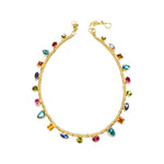 This beautiful necklace features gold plated brass and multicolored crystals in a variety of complimentary shapes. Handmade in Turkey.