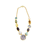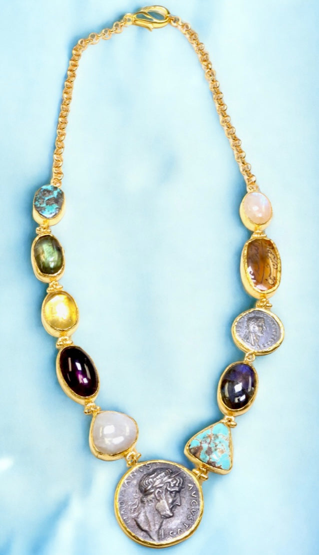 This beautiful necklace features gold plated brass and various colored stones with a silver colored coin pendant. Handmade in Turkey.