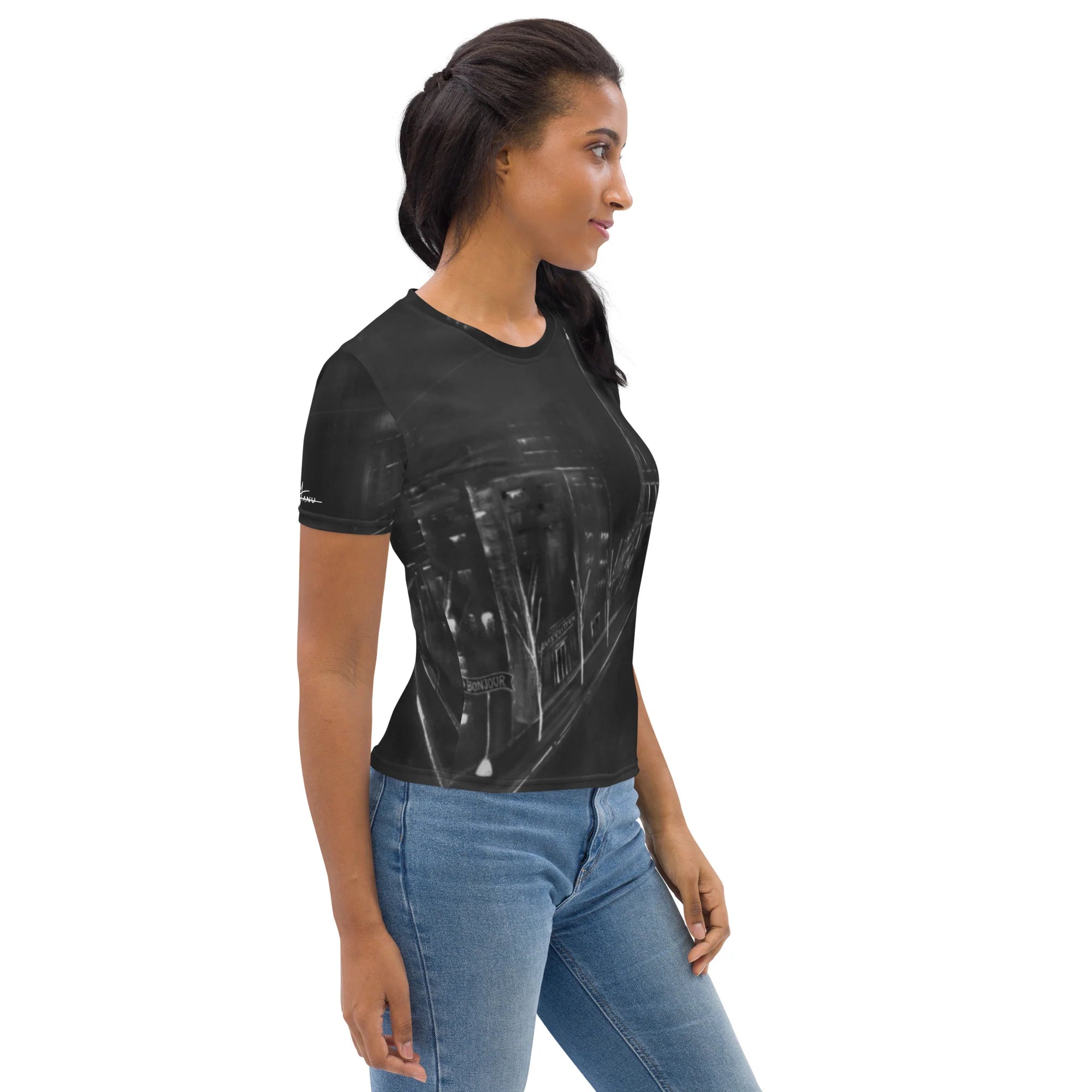 This Marianna Canu design, originated from a piece commissioned exclusively for the Louis Vuitton store in New Orleans. For the original piece, Marianna was tasked with incorporating various elements representing different categories of the brand and its French heritage, utilizing a pastel color palette. In creating some of her wearable art, Marianna applied a similar concept using a monochromatic tone by focusing on a specific detail of that artwork, the Eiffel Tower, while also paying tribute to her brother, who was born in the French island of Corsica. Marianna had previously worked with the Louis Vuitton brand for several years, concurrently pursuing her artistic career, before ultimately leaving to focus on her artistic aspirations.