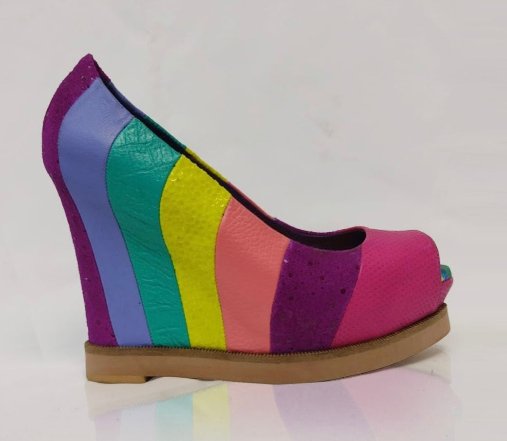 limited edition hand made rainbow multi-color peep toe wedge pump profile