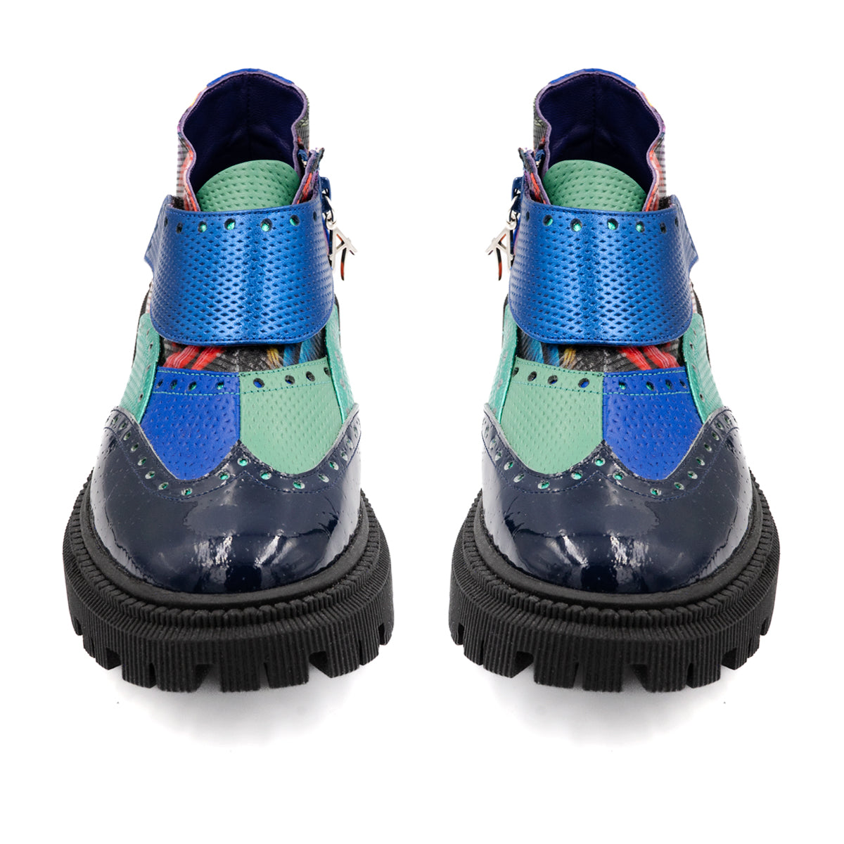 blue multi-color bootie with chunky heel by altura sie7e from Shoe Be Do USA front view