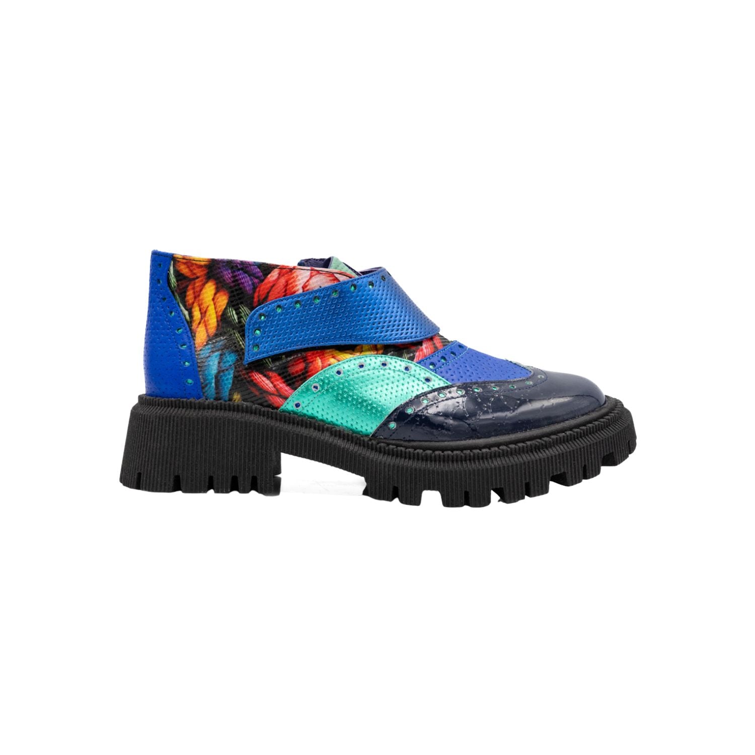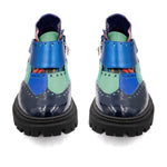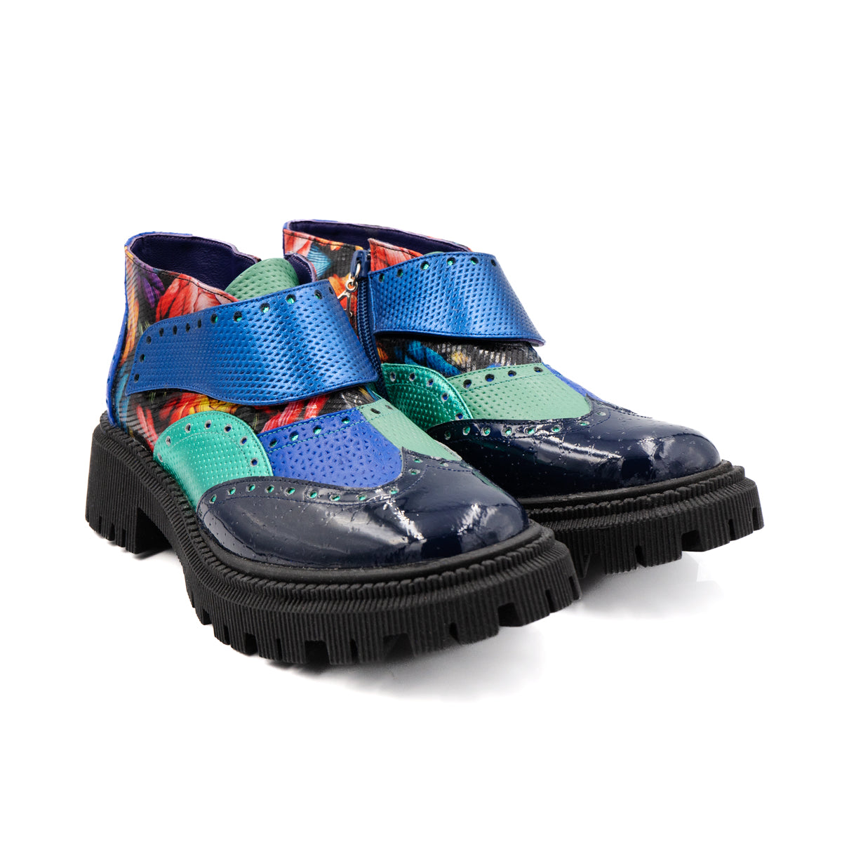blue multi-color bootie with chunky heel by altura sie7e from Shoe Be Do USA