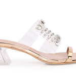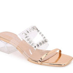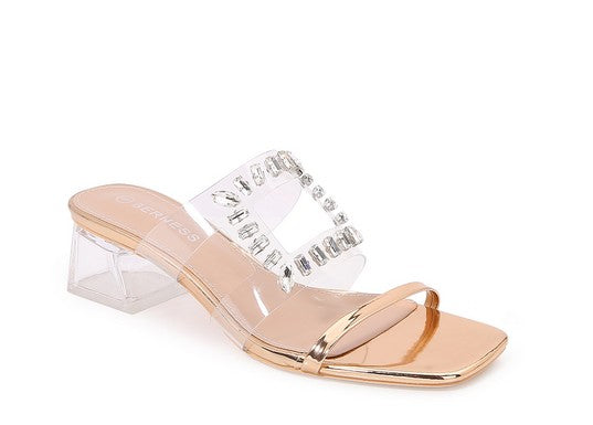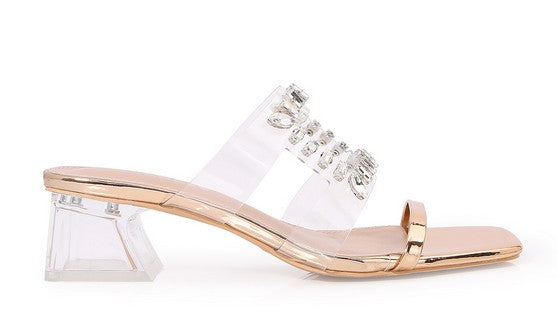 The Desire slide from Berness features a clear and metallic upper with rhinestone detail, and a clear heel.
