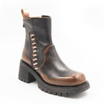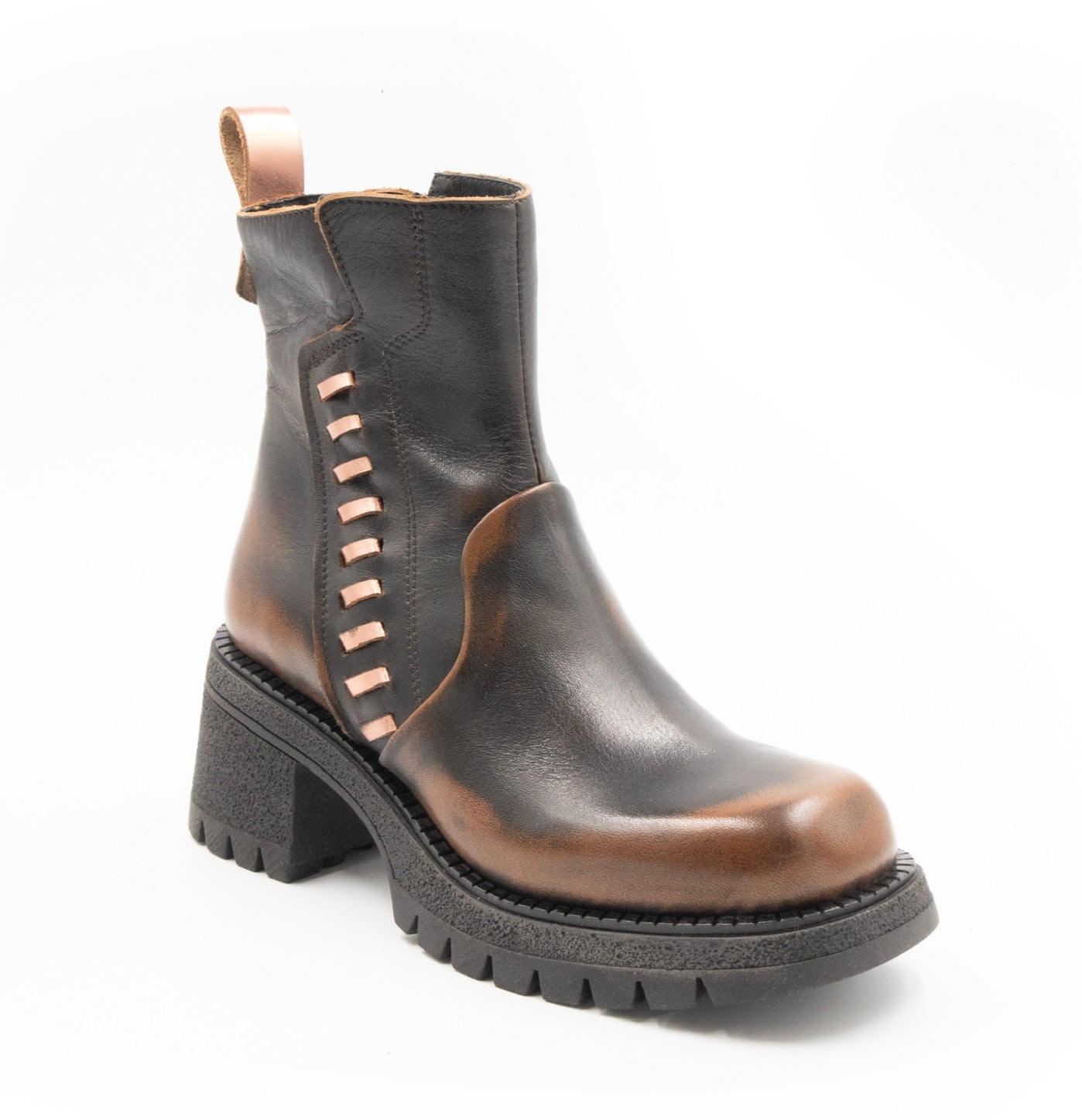 The Loon Boot from Casta features a distressed leather upper with contrast metallic leather detailing, and a lug sole.